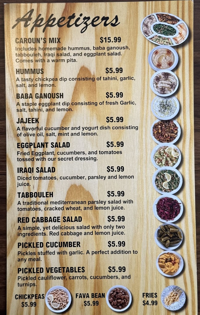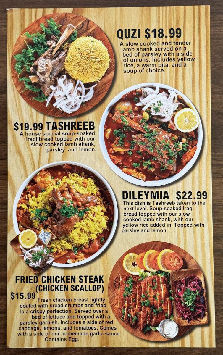 Includes homemade hummus, baba ganoush, tabbouleh, Iraqi salad, and eggplant salad.Comes with a warm pita.