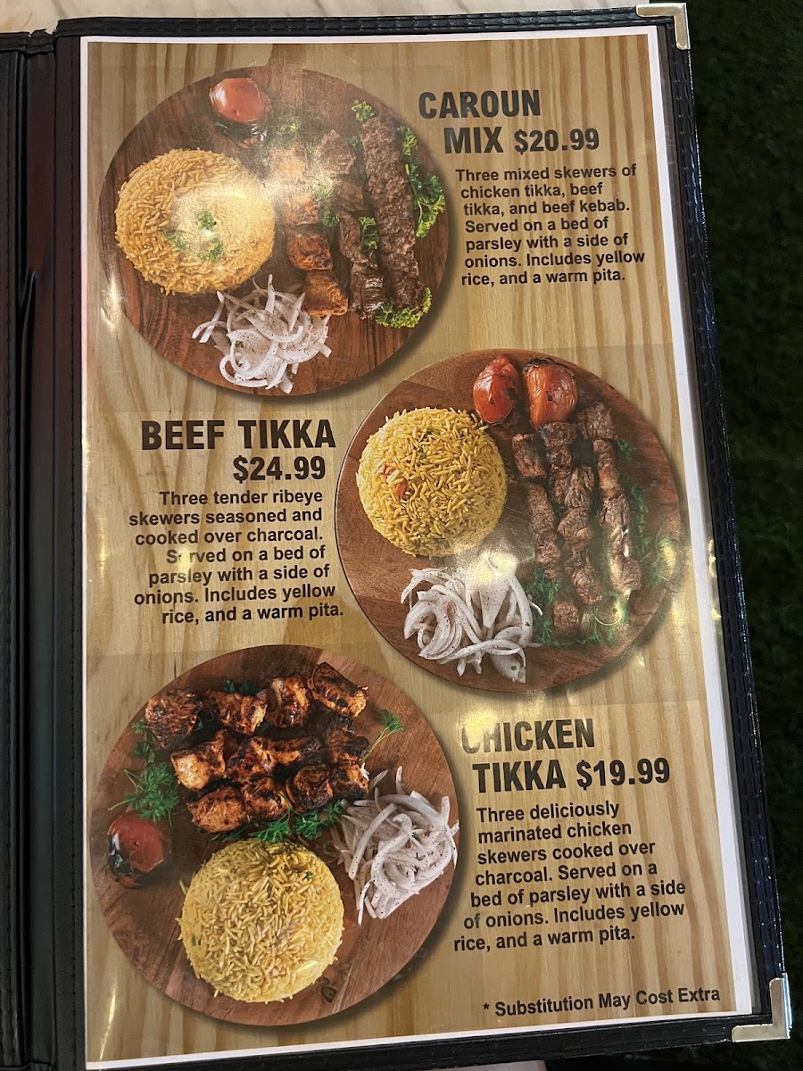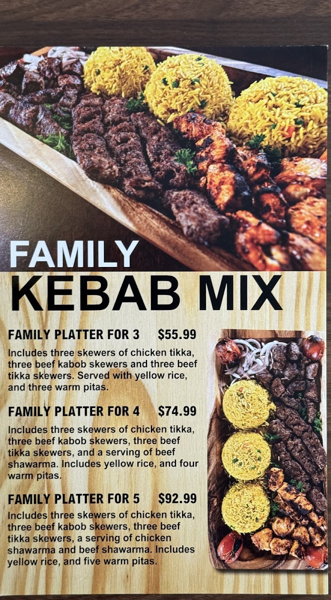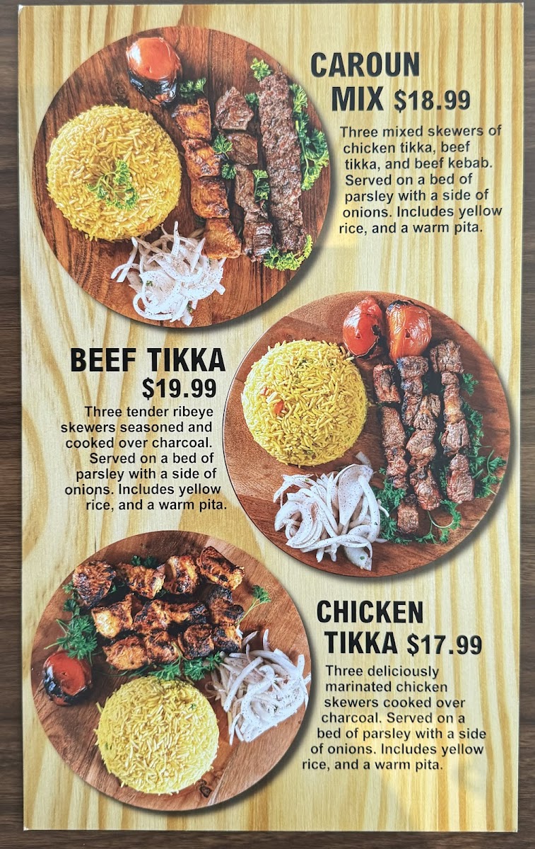 Three mixed skewers of chicken tikka, beef tikka, and beef kebab. Served on a bed of parsley with a side of onions. Includes yellow rice, a warm pita.