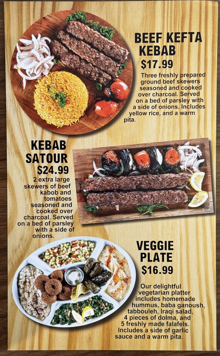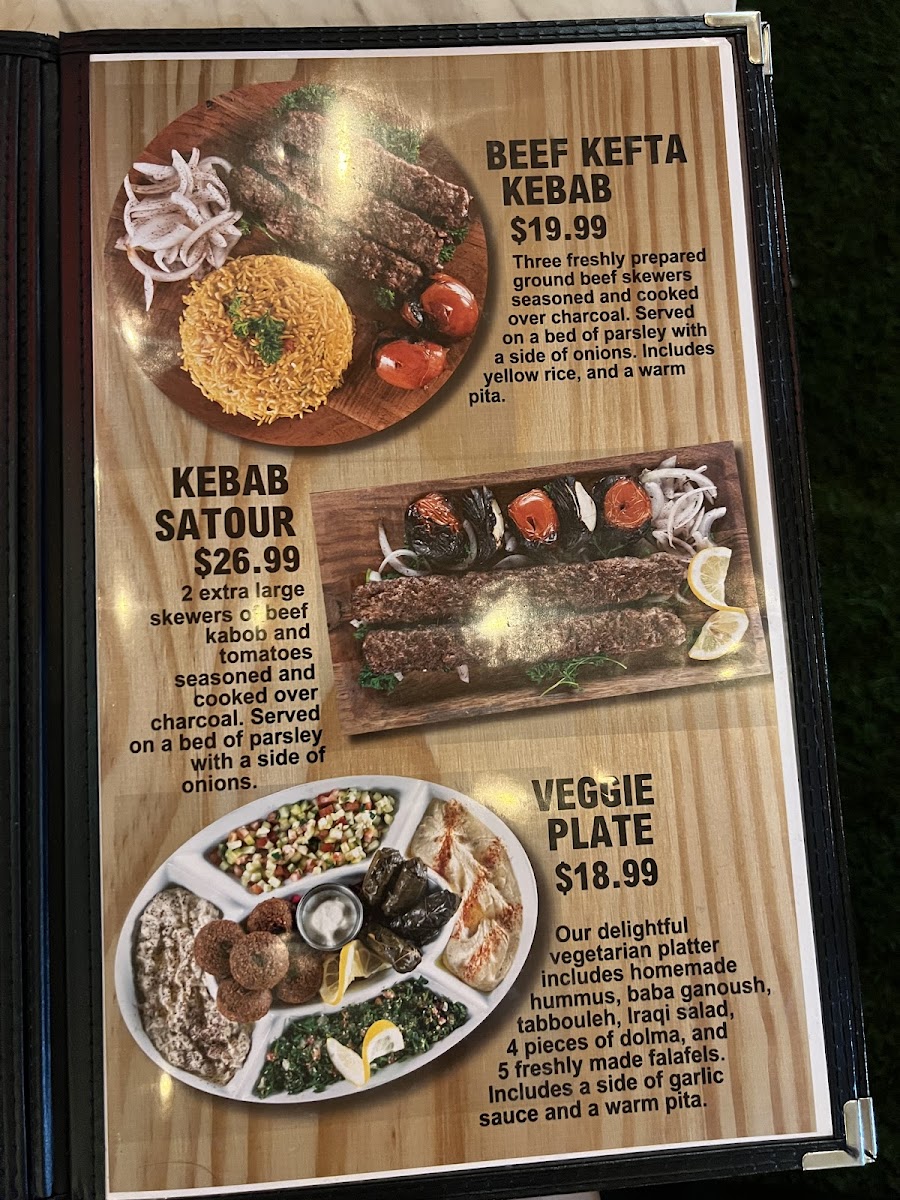 Our delightful vegetarian platter includes homemade hummus, baba ganoush, tabbouleh, Iraqi