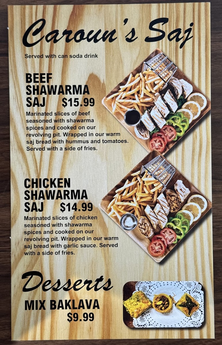 Marinated slices of beef seasoned with shawarma spices and cooked on our revolving pit. Wrapped in our warm saj bread with hummus and tomatoes. Served with a side of fries.